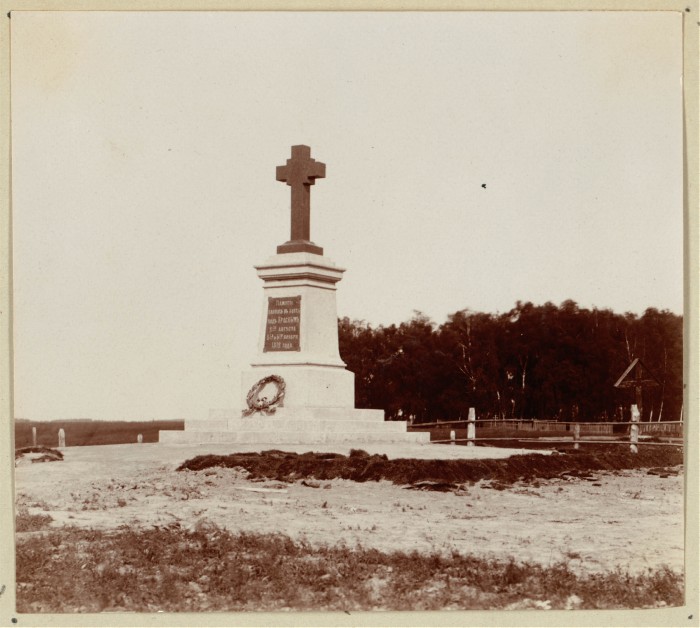 1912. Памятник войны 1812 г. у г. Красного. Надпись: "Памяти павшим в боях под Красным 2-го августа, 5-го и 6-го ноября 1812 года." 2 авг. 1812 г. дивизия ген. Неверовского, только что сформированная из рекрут, была атакована при К. главными силами франц. конницы (15 тыс.), предводимыми Мюратом и поддержанными корпусом маршала Нея. Несмотря на несоразмерность сил и непрерывные атаки противника, Неверовский успел благополучно отступить на Смоленск. Второе столкновение под К. произошло во время отступления Наполеона из Москвы и продолжалось с 3 по 6 ноября. Выходившие из Смоленска эшелоны неприятельской армии были задерживаемы нашими войсками на дороге в К. Франц. арьергард, под начальством Нея, был почти окончательно уничтожен. За этот 4-дневный бой фельдмаршал Кутузов получил титул Смоленского, а атаман Платов - графское достоинство. Французы оставили в руках русских 26 тыс. пленных, 116 пушек и огромный обоз. В память этого события здесь поставлена чугунная колонна.