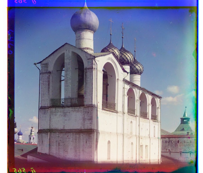 1911. Звонница Кремля, построенная митрополитом Ионой. Самый большой колокол звонницы Успенского собора весил две тысячи пудов и назывался Сысой. Отлит в 1688 г. мастером Флором Терентьевым. Имя ему дал сам Ростовский митрополит Иона в память о своем отце, простом сельском священнике.