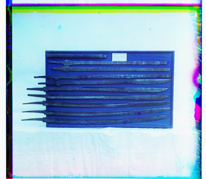 Последовательный ход выделки клинков, ножен и изготовление сварочного булата на Златоустовском заводе. Образцы солдатских шашек. Надпись: "Музей Златоустовского горного округа. Десять оборотов ковки шашечного клинка литой стали. Клинковый цех". Златоустовский завод, г. Златоуст, Уфимская губерния.