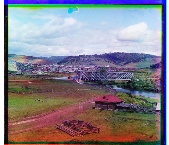 Вид на Миньярский завод. Железнодорожный мост через р. Сим. Уфимский уезд.