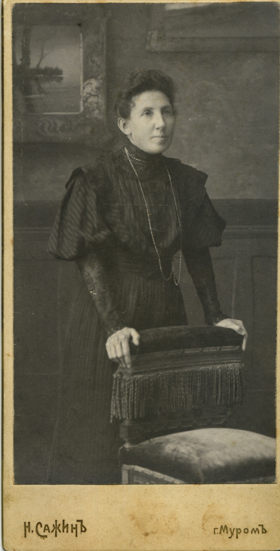 Фотоателье Н. Сажина, Муром.Портрет начальницы Муромской женской гимназии Н. Буевской. На обороте надпись: «Муром, 1909. 4 сентября. Дорогой и милой мне шалунье на память о нашем споре в 1909 г. Буду ждать того времени, когда узнаю, что мои пожеланья о профессии осуществились. Счастливой жизни желаю всем сердцем».