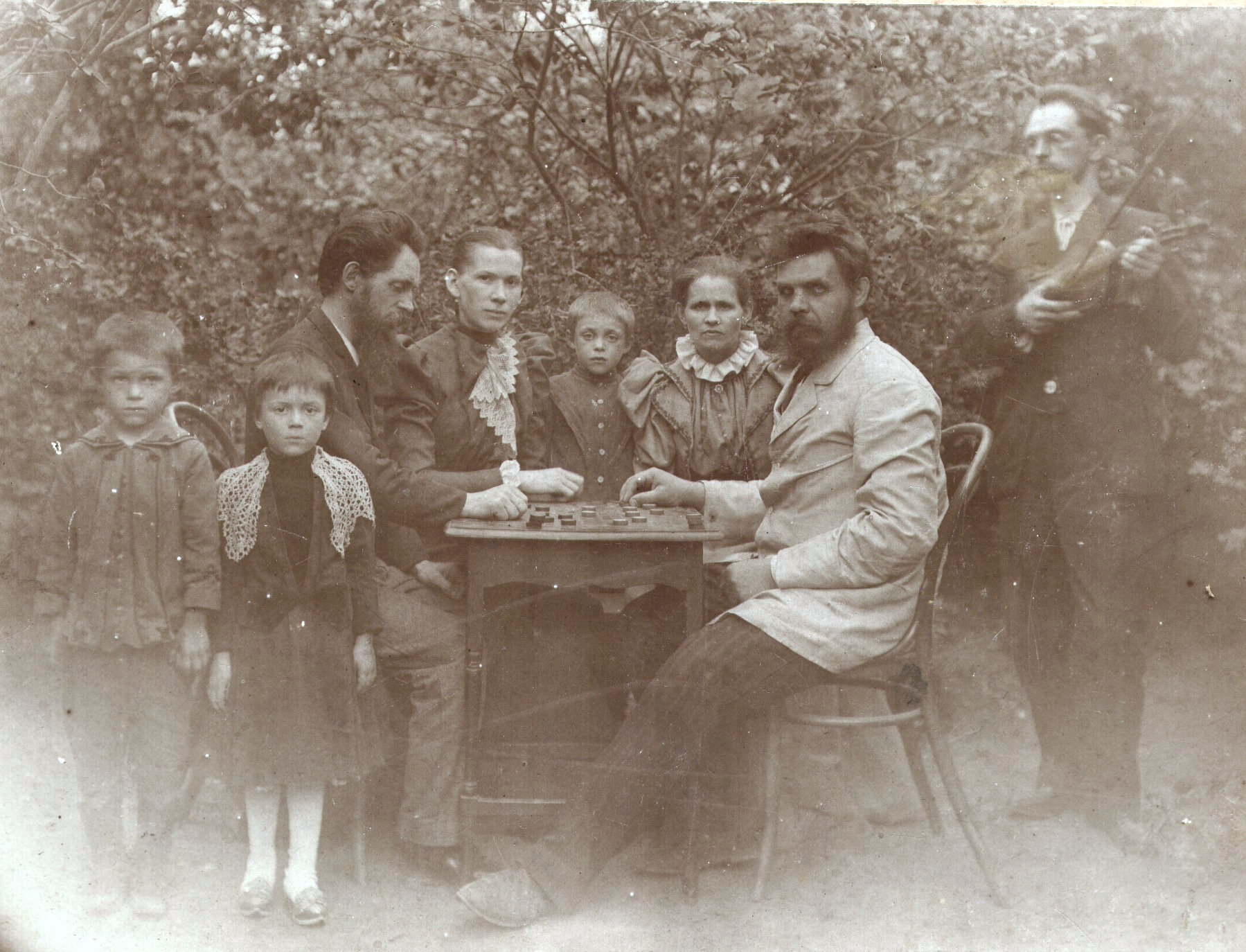 Игра в шашки в саду дома. Слева (сидит за столом) Виктор Петрович Тагунов. Справа стоит музыкант со скрипкой. Муром, 1910-е годы. Архив Тагуновых.
