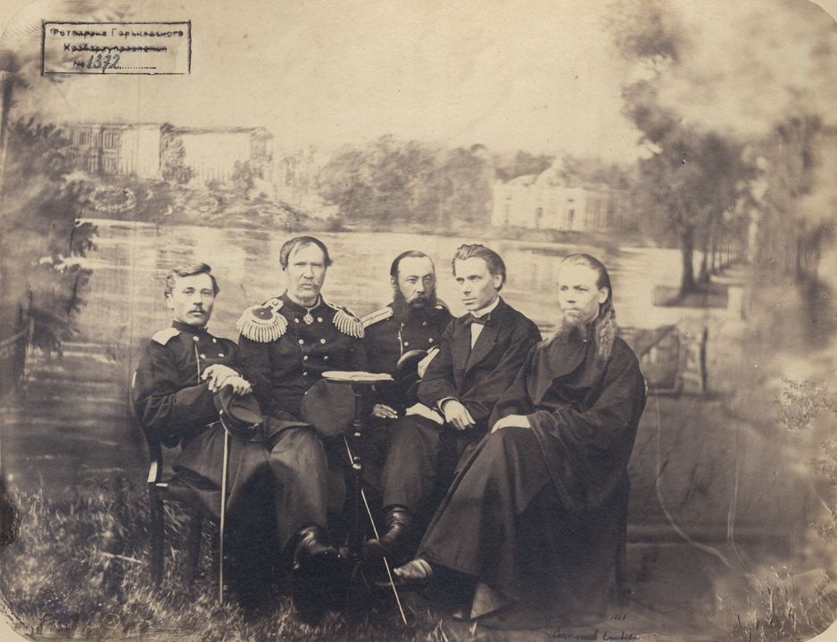 Группа воспитателей Нижегородского Кадетского корпуса: Кракмейер, Сивалов, Мельников, Клевезат, дьякон Храбров. Дата: 1866 г. Место съемки: г. Н.Новгород Автор: Иванов