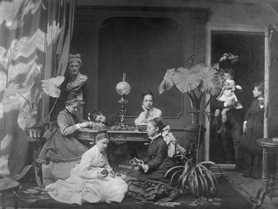 Пелагея Васильевна Дзержинская в белом платье, сидящая на полу с подругами. Автор: А.О. Карелин Место события: г. Н.Новгород Дата: к. ХIХ в.