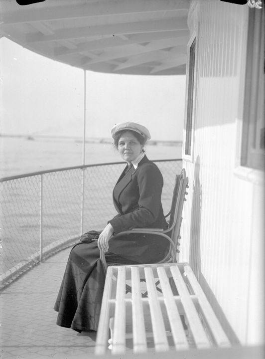 Дама в темном платье на палубе парохода (сидит на стуле). Автор: В.А. Зевеке Место события: неизвестно Дата: 1915-1916 гг.