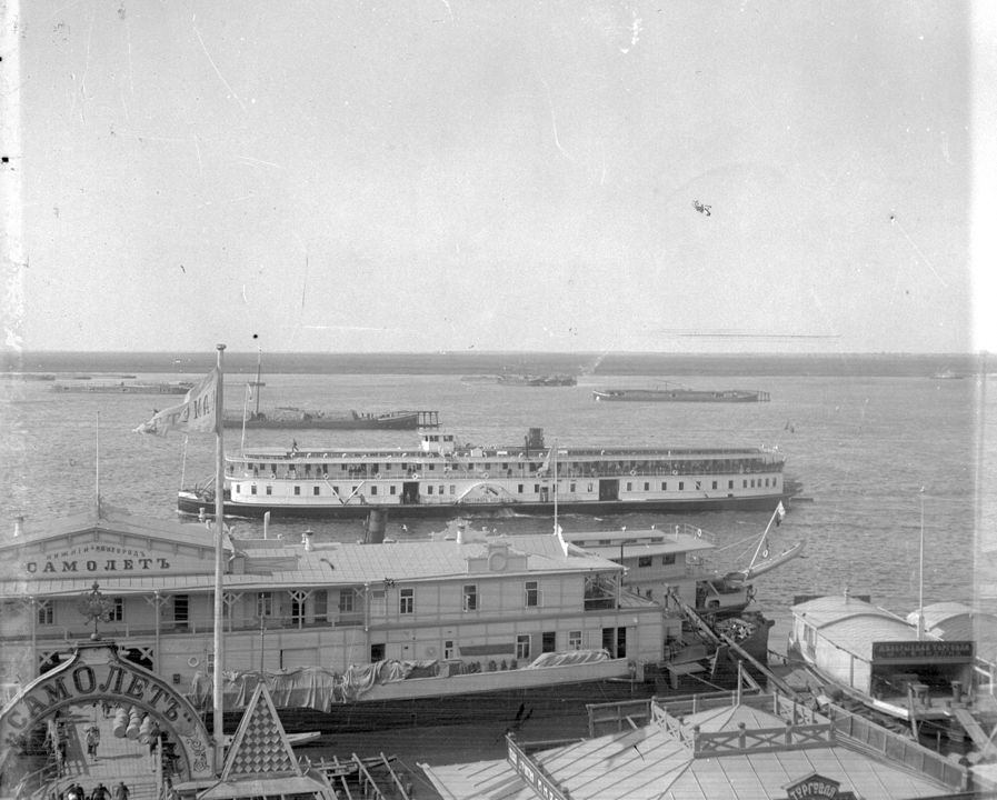 Вид на реку Волгу. На переднем плане - дебаркадер судоходного общества «Самолет». Автор: В.А. Зевеке Место события: г. Н.Новгород Дата: к. XIX - нач. ХХ вв.