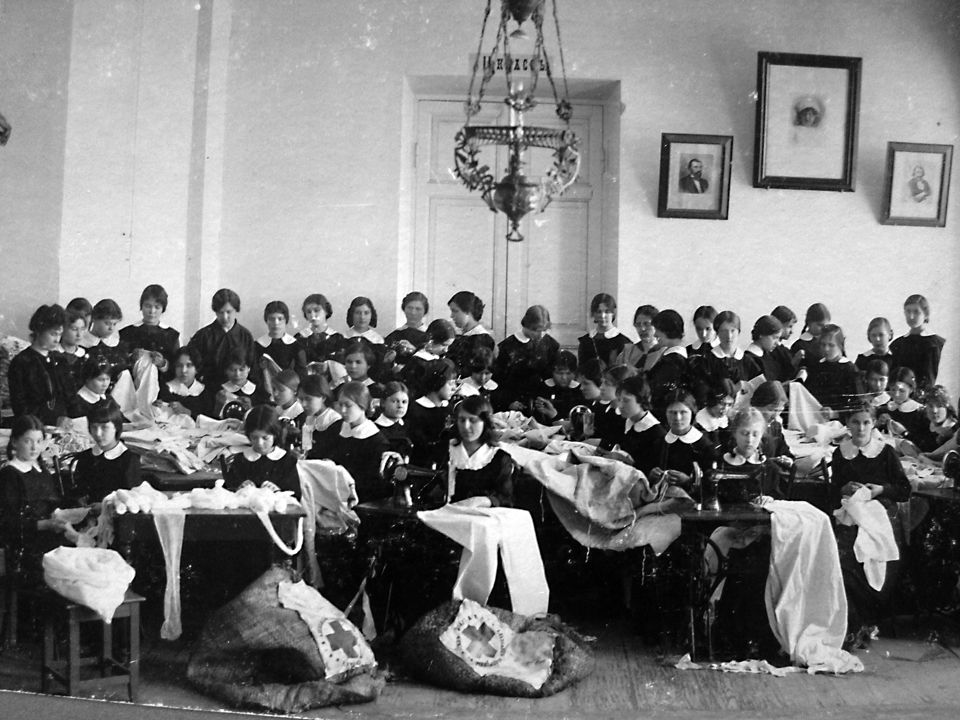 Ученицы Ардатовской женской гимназии за шитьем белья для «Красного креста». Ардатов.