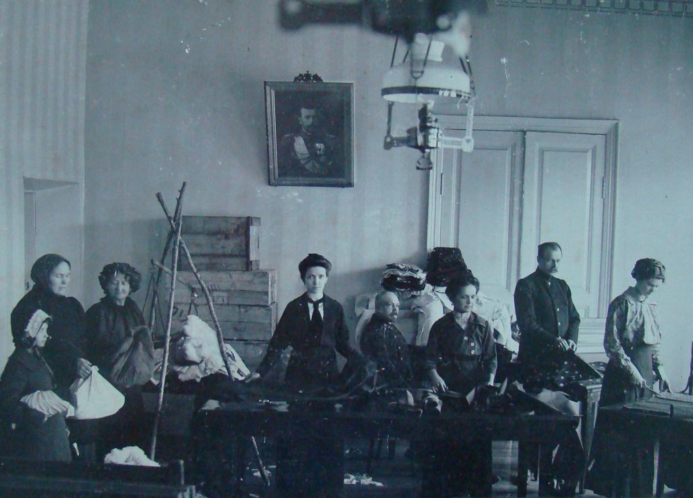 Ученицы Ардатовской женской гимназии за шитьем белья для «Красного креста». Автор: С. Тимин Место события: Ардатов Дата: 1915 г.