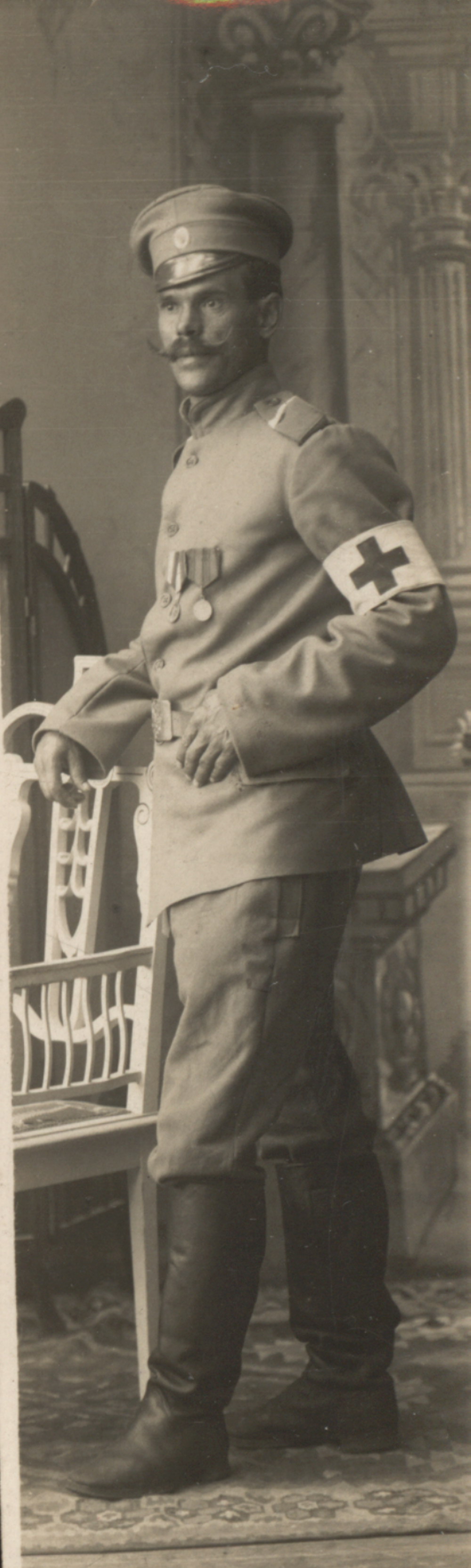Фотограф неизвестен, место съемки неизвестно. Фотопортрет Николая Николаевича Спиридонова, участника первой мировой войны, санитара 33-его военно-полевого госпиталя при Первой Действующей армии, июль 1914 г.