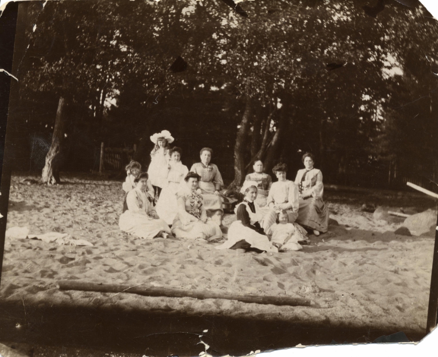 Наталья Павловна Дурдина с дочерьми и неизвестными женщинами на берегу на фоне деревьев