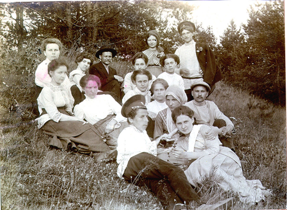 Наталия Павловна Дурдина с матерью и неизвестными женщинами у лестницы перед домом