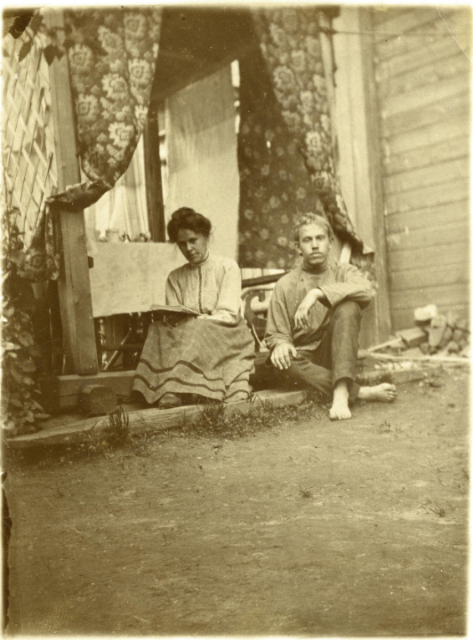 Наталия Павловна Дурдина с матерью и неизвестными женщинами у лестницы перед домом