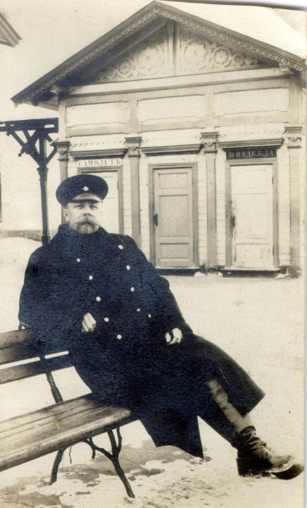 Начальник железнодорожной станции Рыбинск пассажирский Иван Васильевич Босторин на скамейке у одного из станционных зданий