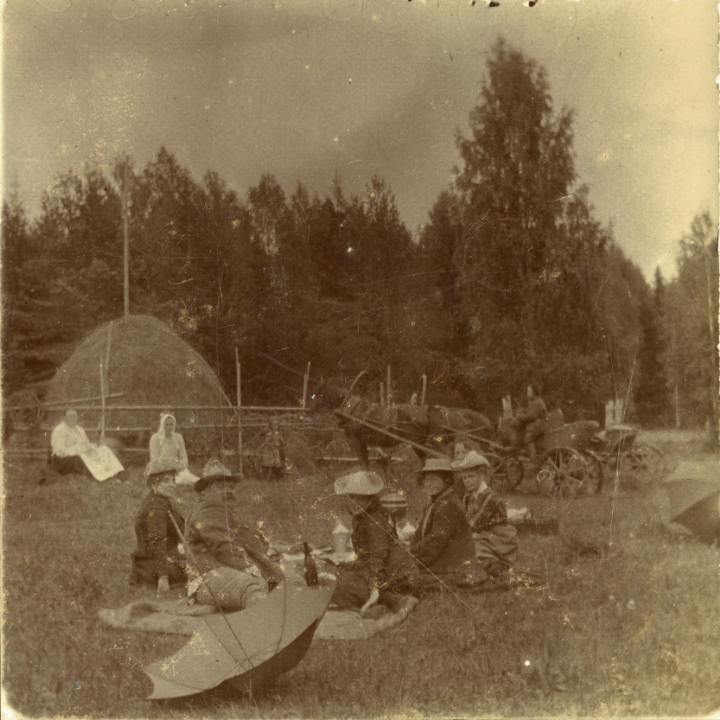 Наталия Павловна Дурдина с матерью и неизвестными женщинами у лестницы перед домом
