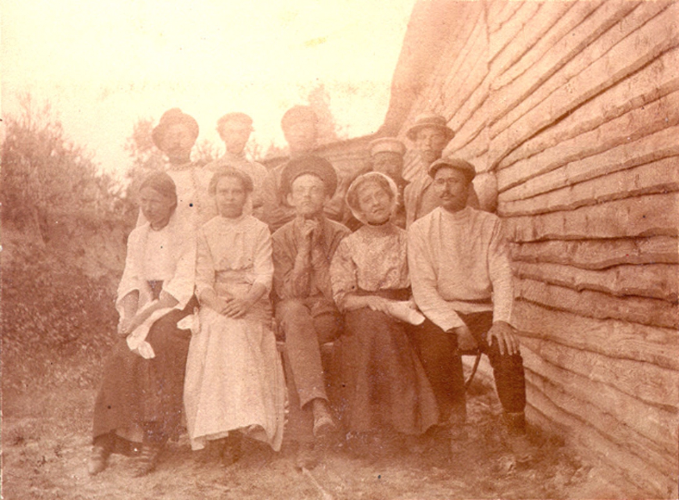 Наталия Павловна Дурдина с матерью и неизвестными женщинами у лестницы перед домом