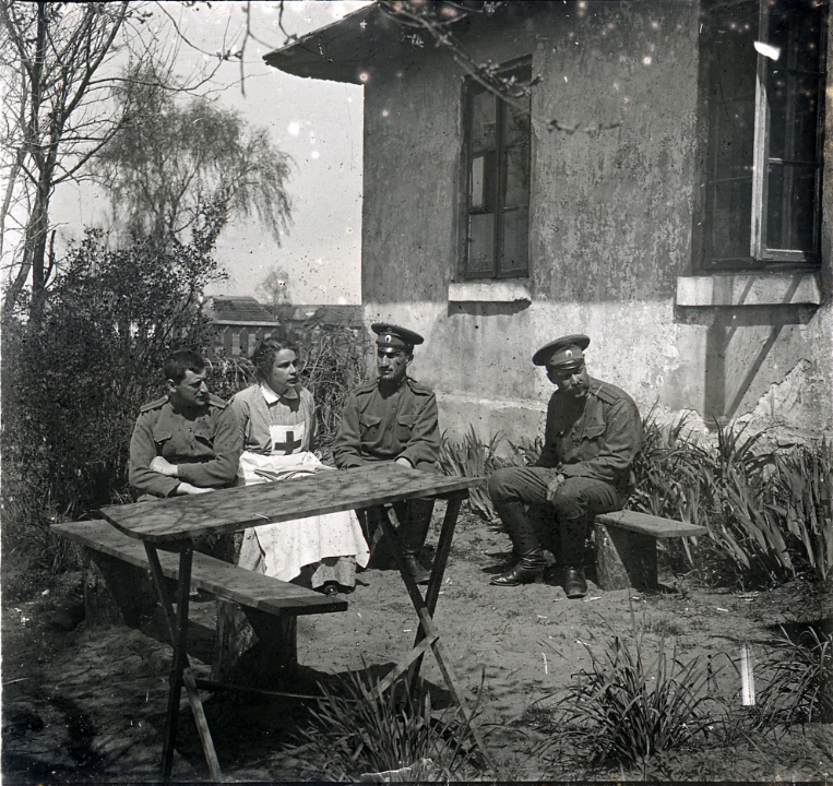 Наталия Павловна Дурдина с матерью и неизвестными женщинами у лестницы перед домом