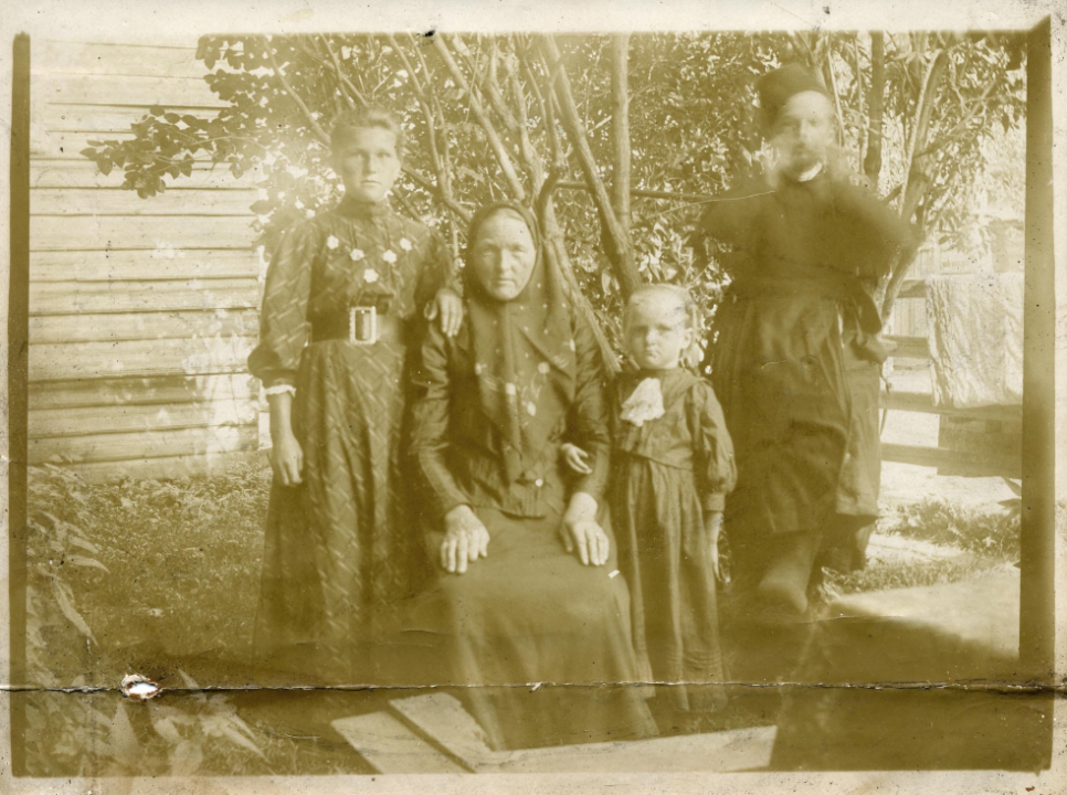 Смирнова Марфа Григорьевна (1859-1937(?)) с дочерьми Марией (слева) и Екатериной (справа) и с мужем Иваном Афанасьевичем(?)