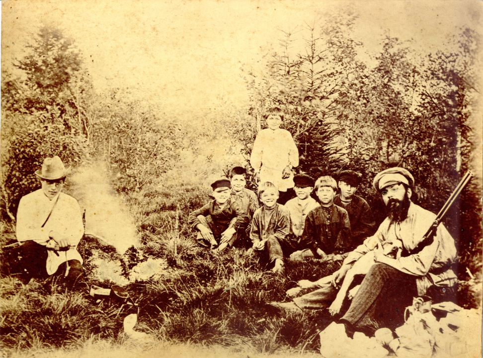 Евгений Николаевич Опочинин с собакой, егерем и крестьянскими детьми.