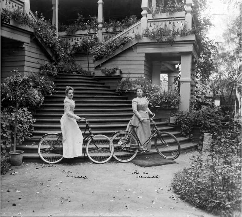 А.В.Михалкова и Н.И.Хлебникова с велосипедами у лестницы дома в усадьбе Петровское