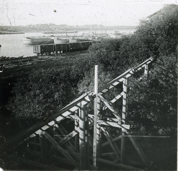 Копаево: часть железнодорожной ветки с вагонами и пристань