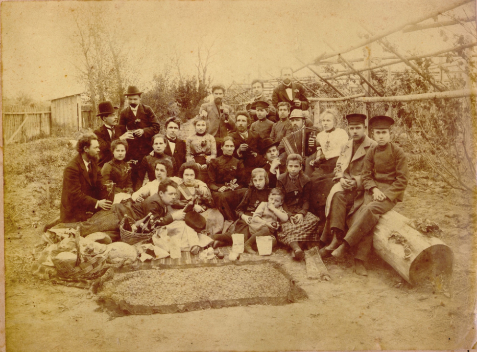 Наталия Павловна Дурдина с матерью и неизвестными женщинами у лестницы перед домом