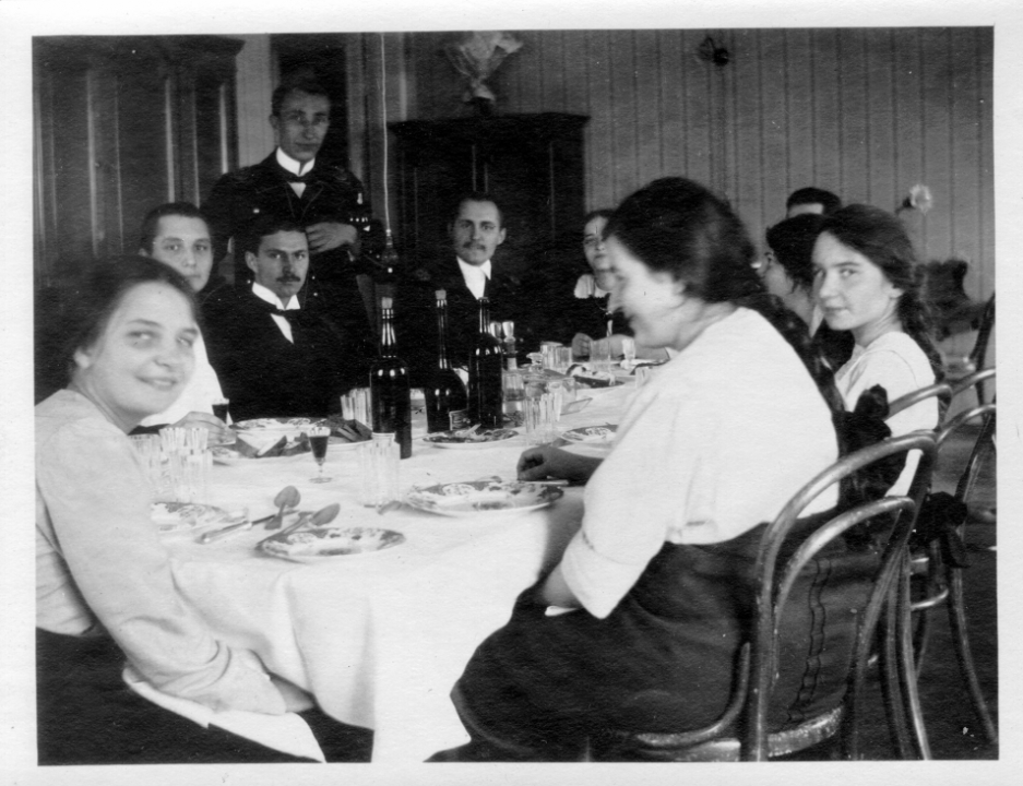 Наталия Павловна Дурдина с матерью и неизвестными женщинами у лестницы перед домом