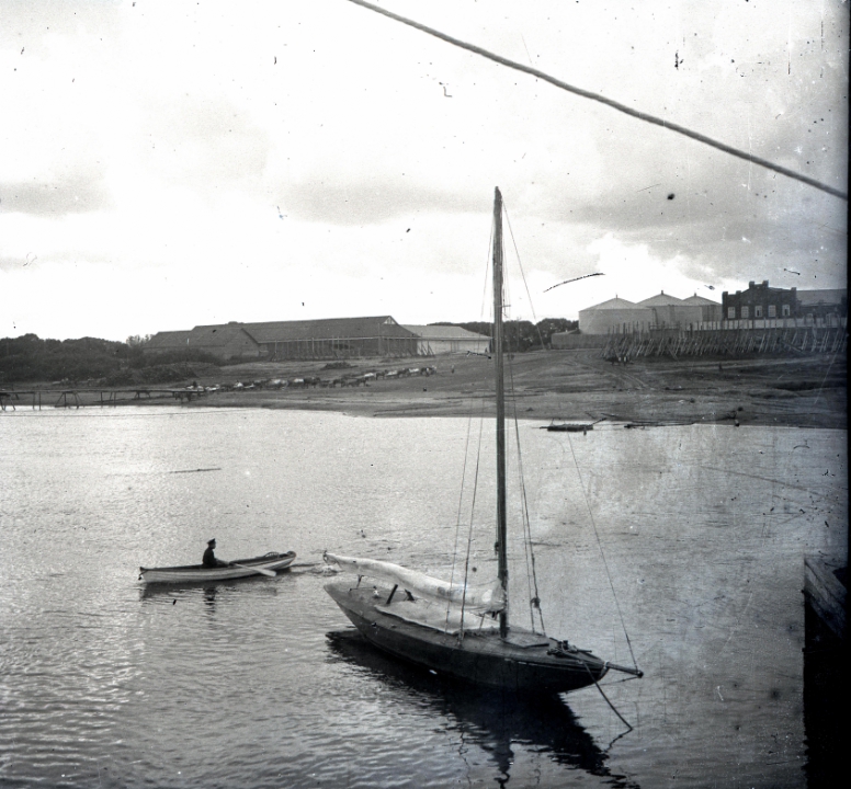 Барка на реке, вдали виден берег со строениями