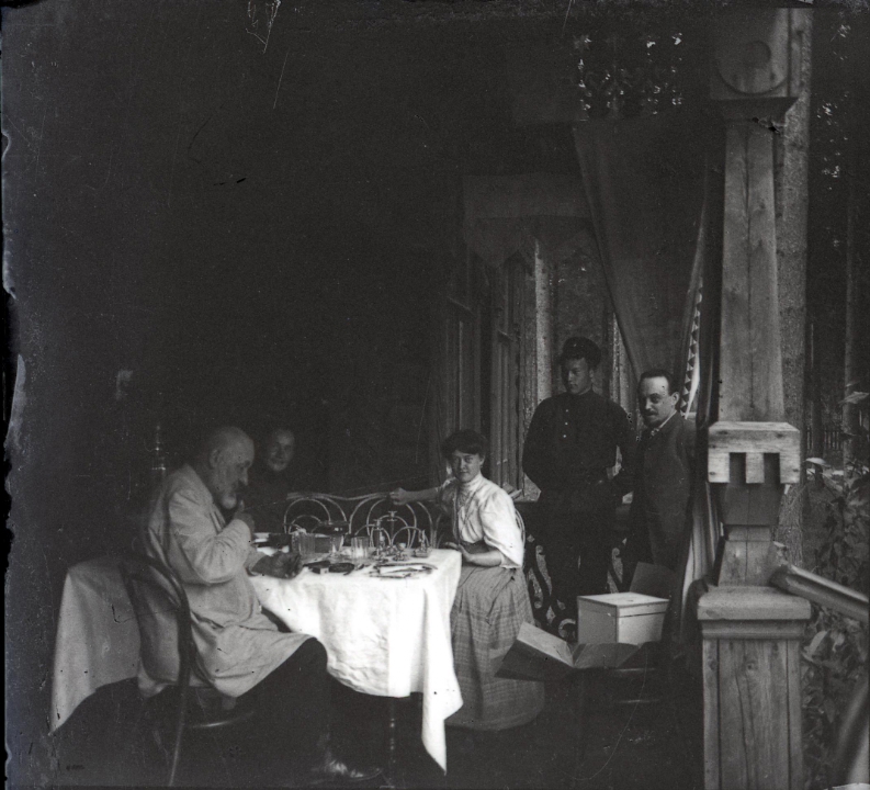 Наталия Павловна Дурдина с матерью и неизвестными женщинами у лестницы перед домом
