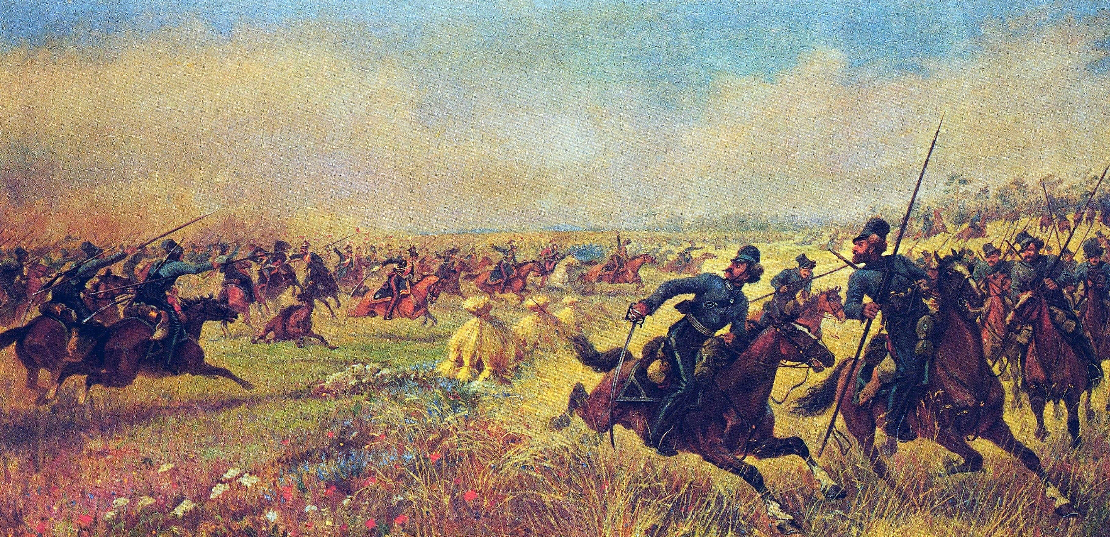 Платов решил сам напасть на французов, не ожидая их наступления. Поставив пехоту и артиллерию за селением Мир на Несвижской дороге, герой-атаман выдвинул вперед казаков, которые завязали перестрелку с передовыми частями отряда Рожнецкого и сейчас же начали отступать. Пылкие поляки снова поддались обману и горячо бросились за селение Мир. Но казаки так быстро ускакали, как будто их и не было... Полки Рожнецкого, Турно и Дзевановского остановились на привале и стали кормить лошадей. И вот тут-то вихрем налетел на них Платов. Отовсюду, из лесов, деревень, из-за песчаных холмов мчались казаки; загремели на карьере, срываясь на позицию донские пушки. Уланы графа Турно бросились было на казаков, но их встретили ахтырские гусары. Все перемешалось. Тихий лес вдруг ожил от выстрелов пехоты и спешенных казаков. Из деревень, сотня за сотней, вылетали казаки…