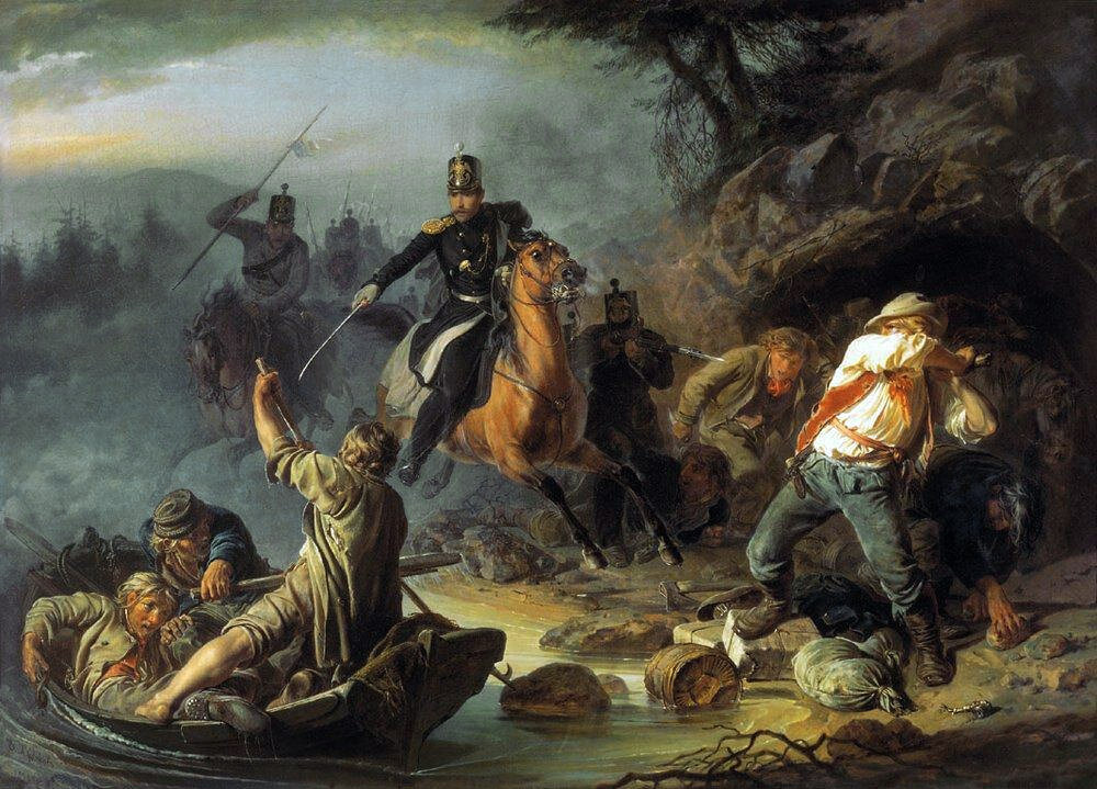 a:2:{s:4:"TEXT";s:684:"Захват группы контрабандистов из числа жителей Великого княжества Финляндского, многие из которых промышляли нелегальной переправкой товаров через границу Российской империи. В списке чаще всего встречавшихся в то время предметов контрабанды значатся кофе, соль, коньяк и «белая английская жесть» <br><br> Свод Устава Таможенных изданий. 1842 г. Из статьи 1357: «Если под тайно провозимыми иностранными товарами, пошлиной обложенными или запрещенными к провозу, задержаны лошади, повозки, суда, и будет доказано, что товары на них везли из-за границы или с черты границы или корабля, то оныя конфискуются...» <br><br> Автор картины был очевидцем изображенного происшествия. ";s:4:"TYPE";s:4:"html";}