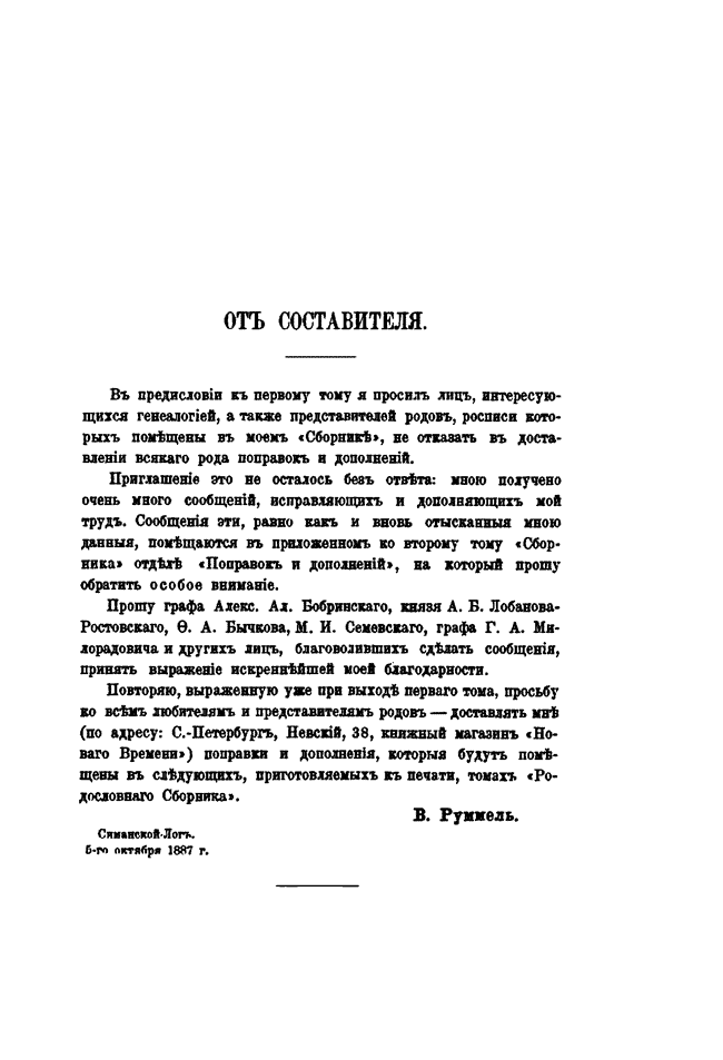 Большинство родословных, представленных в сборнике, нигде до момента выпуска не публиковались. Данные для книги были составлены на основании дел архива департамента Герольдии, а также разных исторических источников и сведений, полученных авторами непосредственно от представителей родов. Основные данные были собраны Витольдом Владиславовичем Руммелем, меньшая часть — списки семи фамилий (графы Васильевы, Галаховы, Голубцовы, Огаревы, Скобельцыны, Шиловские, Юшковы) — Владимиром Владимировичем Голубцовым.