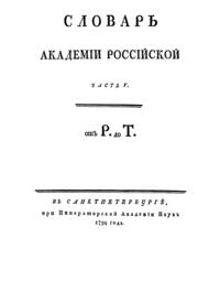 Знаменитый словарь Российской Академии, первый толковый словарь русского языка, содержащий 43 357 слов в 6 частях. Работа над словарём началась в 1783 году, и заняла 11 лет.
