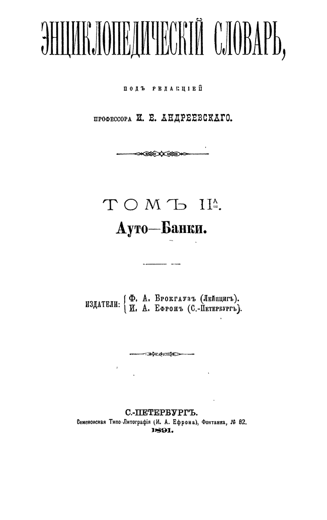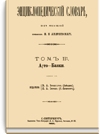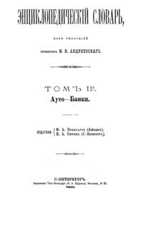 Самая крупная дореволюционная русская универсальная энциклопедия, выпущенная акционерным издательским обществом «Ф. А. Брокгауз — И. А. Ефрон». Состоит из 86 томов (82 основных и 4 дополнительных), выходивших в течение 1890-1907 годов. Первые 8 томов (до буквы «В») вышли под общей редакцией профессора И. Е. Андреевского и в основном содержали переводы на русский язык статей знаменитой немецкой энциклопедии Брокгауза «Konversations Lexikon».