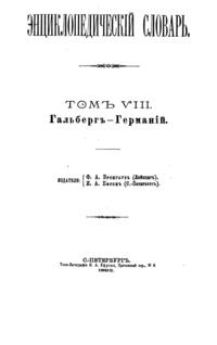 Самая крупная дореволюционная русская универсальная энциклопедия, выпущенная акционерным издательским обществом «Ф. А. Брокгауз — И. А. Ефрон». Состоит из 86 томов (82 основных и 4 дополнительных), выходивших в течение 1890-1907 годов. Первые 8 томов (до буквы «В») вышли под общей редакцией профессора И. Е. Андреевского и в основном содержали переводы на русский язык статей знаменитой немецкой энциклопедии Брокгауза «Konversations Lexikon».
