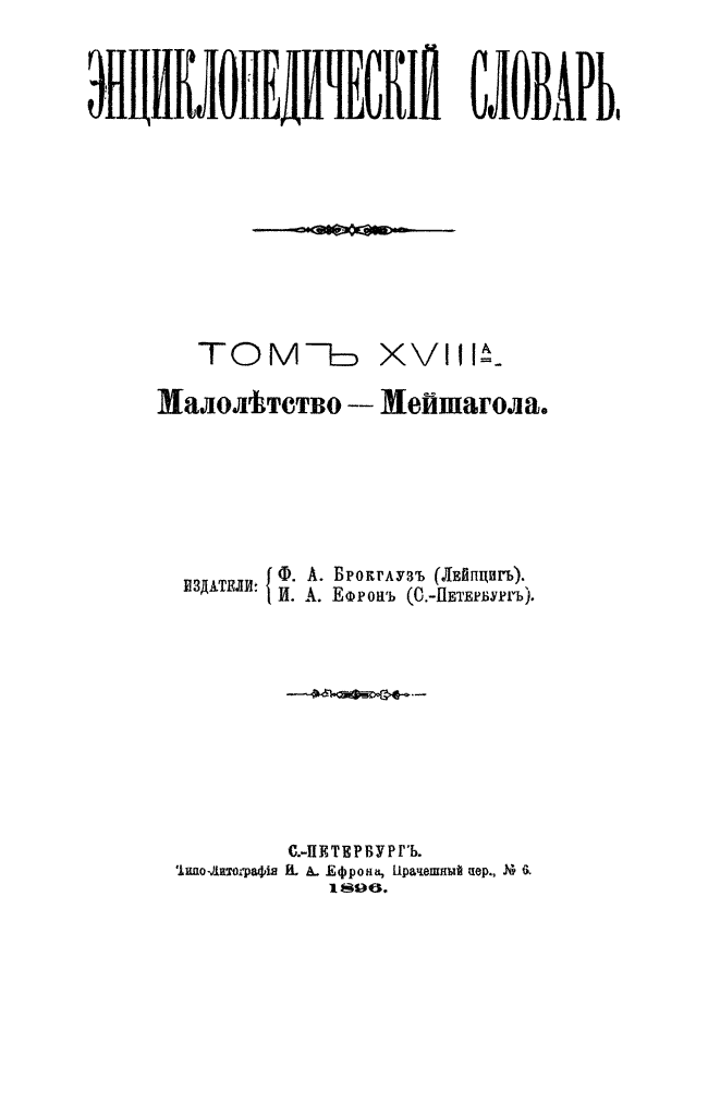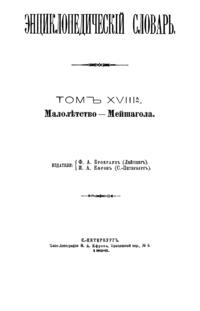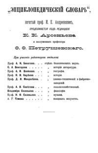 Самая крупная дореволюционная русская универсальная энциклопедия, выпущенная акционерным издательским обществом «Ф. А. Брокгауз — И. А. Ефрон». Состоит из 86 томов (82 основных и 4 дополнительных), выходивших в течение 1890-1907 годов. Первые 8 томов (до буквы «В») вышли под общей редакцией профессора И. Е. Андреевского и в основном содержали переводы на русский язык статей знаменитой немецкой энциклопедии Брокгауза «Konversations Lexikon».