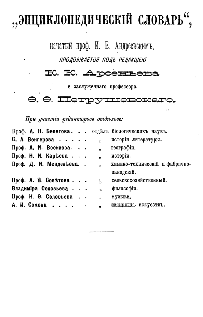 После кончины Андреевского новая редакция во главе с К. К. Арсеньевым и Ф. Ф. Петрушевским значительно увеличила число оригинальных статей и привлекла к сотрудничеству широкий круг общественно-политических деятелей либерального толка (от П. Н. Милюкова, В. И. Герье, Н. И. Кареева до легальных марксистов П. Б. Струве и М. И. Туган-Барановского, раздел философии вел крупнейший русский религиозный философ Вл. С. Соловьев), а также таких крупнейших ученых как Д. И. Менделеев, А. И. Бекетов, А. И. Воейков, Д. И. Анучин, Ю. М. Шокальский, Н. М. Книпович, А. О. Ковалевский, А. И. Советов, В. С. Соловьев и др.