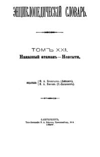 Самая крупная дореволюционная русская универсальная энциклопедия, выпущенная акционерным издательским обществом «Ф. А. Брокгауз — И. А. Ефрон». Состоит из 86 томов (82 основных и 4 дополнительных), выходивших в течение 1890-1907 годов. Первые 8 томов (до буквы «В») вышли под общей редакцией профессора И. Е. Андреевского и в основном содержали переводы на русский язык статей знаменитой немецкой энциклопедии Брокгауза «Konversations Lexikon».