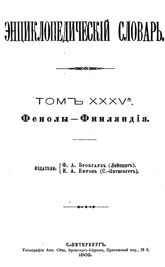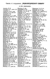 Самая крупная дореволюционная русская универсальная энциклопедия, выпущенная акционерным издательским обществом «Ф. А. Брокгауз — И. А. Ефрон». Состоит из 86 томов (82 основных и 4 дополнительных), выходивших в течение 1890-1907 годов. Первые 8 томов (до буквы «В») вышли под общей редакцией профессора И. Е. Андреевского и в основном содержали переводы на русский язык статей знаменитой немецкой энциклопедии Брокгауза «Konversations Lexikon».