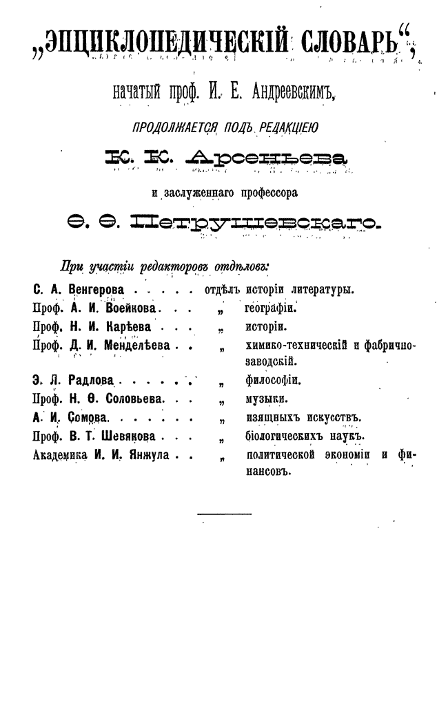 После кончины Андреевского новая редакция во главе с К. К. Арсеньевым и Ф. Ф. Петрушевским значительно увеличила число оригинальных статей и привлекла к сотрудничеству широкий круг общественно-политических деятелей либерального толка (от П. Н. Милюкова, В. И. Герье, Н. И. Кареева до легальных марксистов П. Б. Струве и М. И. Туган-Барановского, раздел философии вел крупнейший русский религиозный философ Вл. С. Соловьев), а также таких крупнейших ученых как Д. И. Менделеев, А. И. Бекетов, А. И. Воейков, Д. И. Анучин, Ю. М. Шокальский, Н. М. Книпович, А. О. Ковалевский, А. И. Советов, В. С. Соловьев и др.