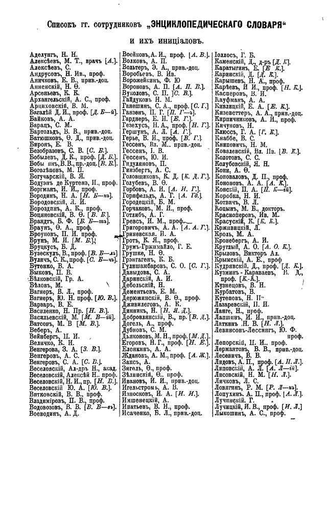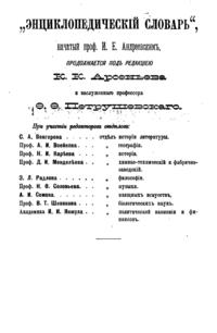 Самая крупная дореволюционная русская универсальная энциклопедия, выпущенная акционерным издательским обществом «Ф. А. Брокгауз — И. А. Ефрон». Состоит из 86 томов (82 основных и 4 дополнительных), выходивших в течение 1890-1907 годов. Первые 8 томов (до буквы «В») вышли под общей редакцией профессора И. Е. Андреевского и в основном содержали переводы на русский язык статей знаменитой немецкой энциклопедии Брокгауза «Konversations Lexikon».