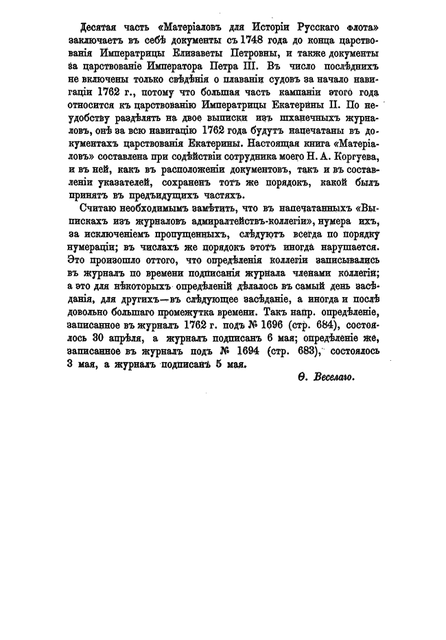 Первые 5 томов издания «Материалы для истории русского флота», изданные в 1865-1875 гг., были подготовлены историографом Российского флота С. И. Елагиным (1824 — 1868). После его смерти работу по написанию «Материалов...» продолжили его сотрудники и Ф.Ф. Веселаго. Всего же было издано 18 томов в период с 1865 по 1904 гг.