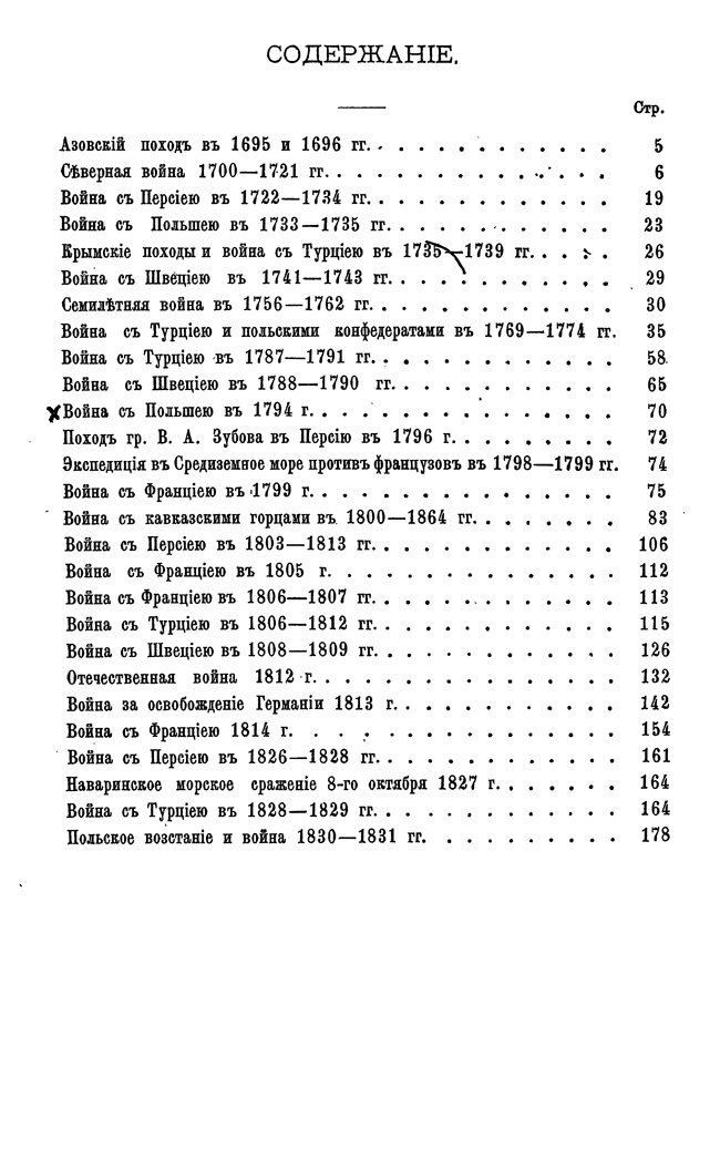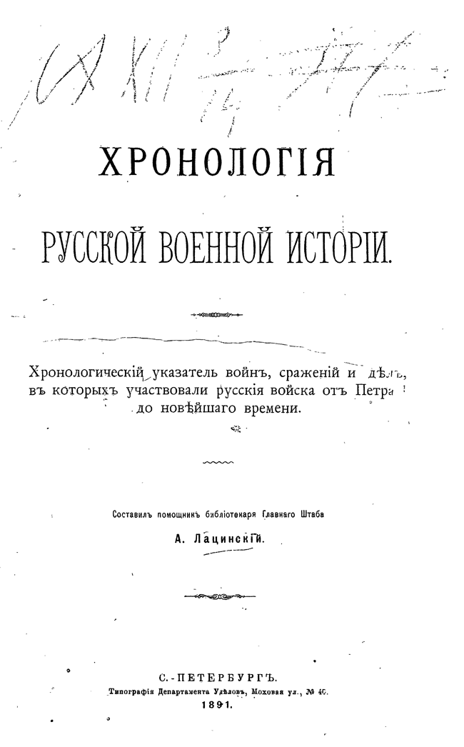 Помощник библиотекаря Главного штаба, А. С. Лацинский, опираясь на уже существующие капитальные труды по истории, составил первый хронологический свод русской военной истории. Работа охватывает период от правления Петра I до новейшего времени. Начиная с царствования Петра Великого, положившего начало регулярному устройству русских войск, Россия в течение двух столетий вела многие войны как в Европе, так и в Азии. На континенте Европы нет страны, за исключением Испании и Португалии, куда не проникали бы русские войска или в качестве неприятеля, или в качестве союзников: Швеция, Дания, Польша, Германия, Франция, Италия, Швейцария, Голландия, Австрия, Венгрия, Турция, Сербия, Болгария, Румыния — были театрами войн. В странах Азии (Кавказ, Персия, Туркестан) Россия также вела многие войны, ознаменовавшиеся победами ее оружия.