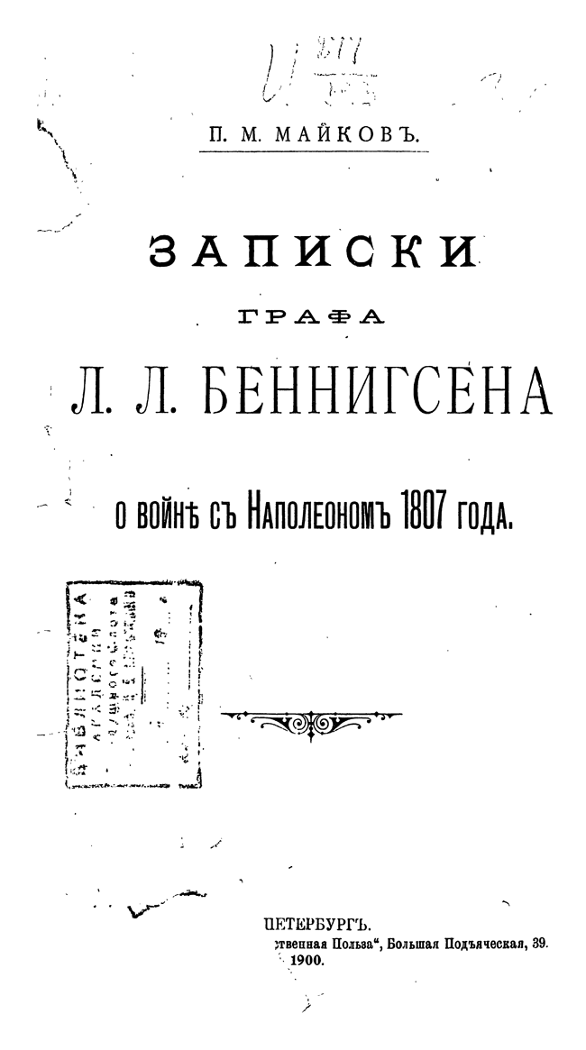Майков подготовил к публикиции записки генерала Беннигсена, посвященные войне 1807 года. Неоднозначно воспринимаемая у нас фигура, получившая славу «закулисного интригана» в период Отечественной войны, в кампании