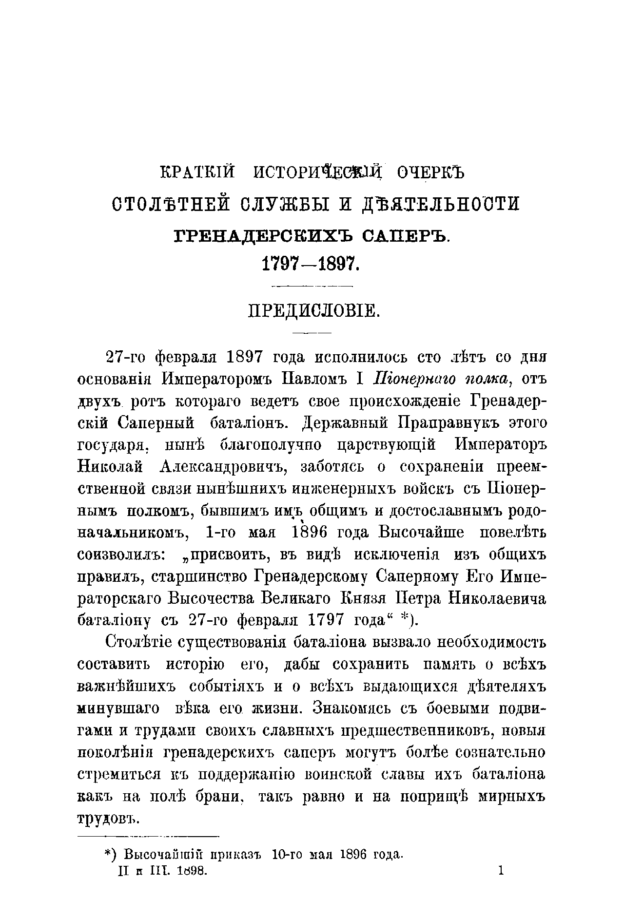 Историческiй очеркъ столѣтней службы и быта Гренадерскихъ саперъ и ихъ предшественниковъ-пiонеръ 1797-1897