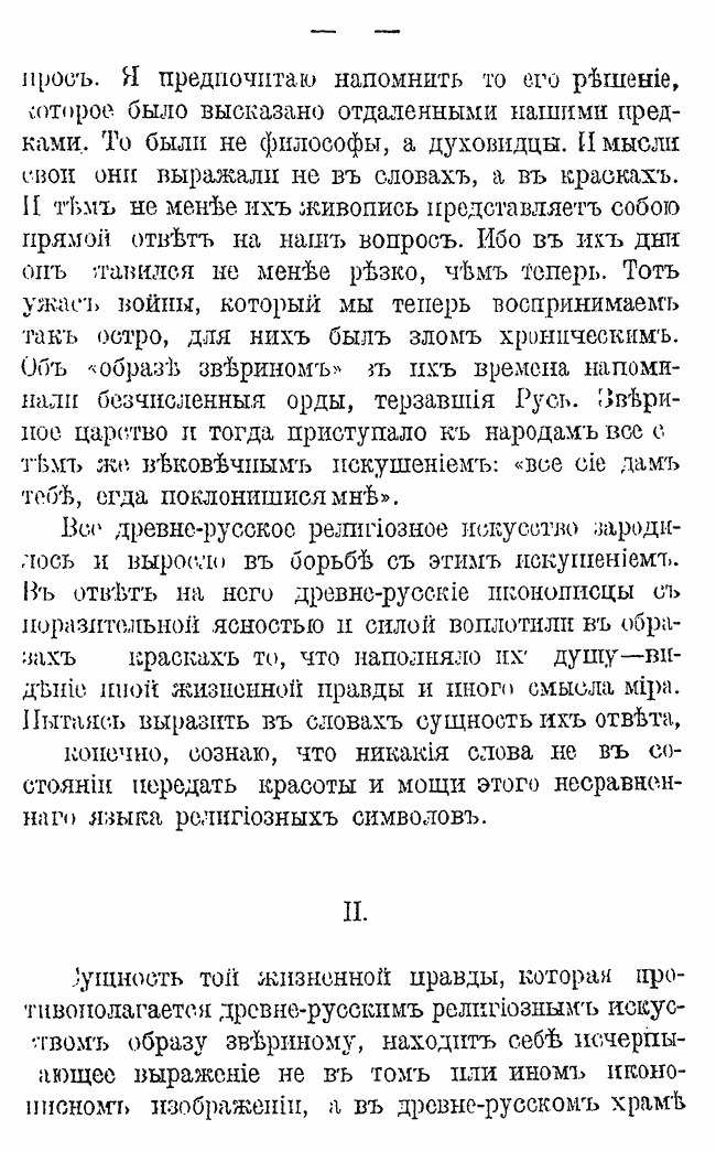 Книга посвящена русской религиозной живописи и символике православного храма. Она написана во время Первой мировой войны, когда обнажаются мировое зло и бессмыслица, а «целые народы все свои помыслы сосредотачивают на одной цели – создании большой челюсти для сокрушения и пожирания других народов». В это время особенно остро звучит вопрос, который всегда был основным для человека, вопрос о смысле жизни. Прямой ответ на него представляет древнерусская живопись. Её символический язык передаёт высшее веление, обращённое к сознанию и воле человека, и несёт достоверное знание о том, что над царством зверя есть иной закон жизни, который восторжествует.
