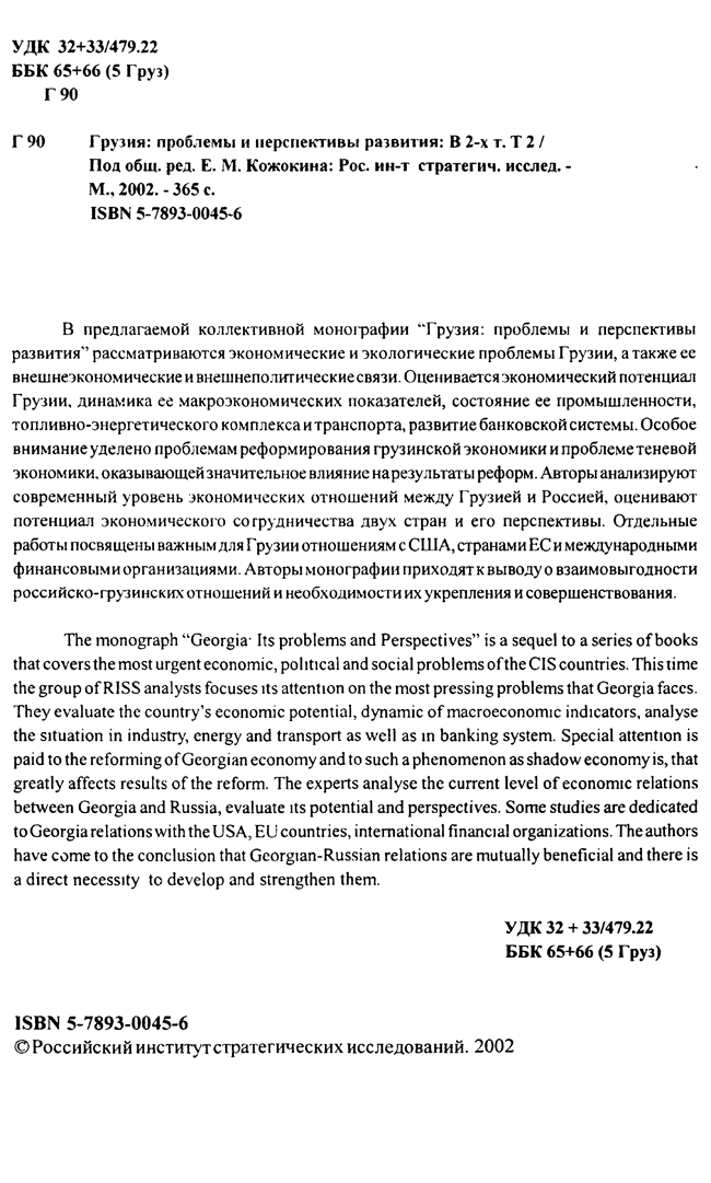 В предлагаемой коллективной монографии «Грузия: проблемы и перспективы развития» рассматриваются экономические и экологические проблемы Грузии, а также ее внешнеэкономические и внешнеполитические связи. Оценивается экономический потенциал Грузии, динамика ее макроэкономических показателей, состояние ее промышленности, топливно-энергетического комплекса и транспорта, развитие банковской системы. Особое внимание уделено проблемам реформирования грузинской экономики и проблеме теневой, оказывающей значительное влияние на результаты реформ. Авторы анализируют современный уровень экономических отношений между Грузией и Россией, оценивают потенциал экономического сотрудничества двух стран и его перспективы. Отдельные работы посвящены важным для Грузии отношениям с США, странами ЕС и международными финансовыми организациями. Авторы монографии приходят к выводу о взаимовыгодности российско-грузинских отношений и необходимости их укрепления и совершенствования.