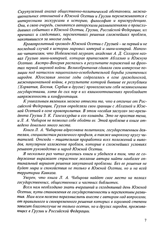 Автором настоящей книги является очевидец и активный участник событий, который в течение восьми труднейших лет (1993-2001) руководил Республикой Южная Осетия сперва в качестве Председателя Верховного Совета, а затем Президента республики. Анализ общественно-политической обстановки, межнациональных отношений в Южной Осетии и Грузии чередуются с интересными экскурсами в историю, философию и юриспруденцию. Они, в свою очередь, сменяются авторскими размышлениями о происходивших событиях в Южной Осетии, Грузии, Российской Федерации, их причинах и следствиях, перспективах решения сложившихся проблем, накопившихся за многие годы.