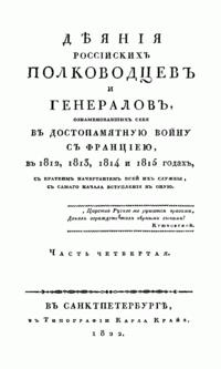 Дѣянiя россiйскихъ полководцевъ и генераловъ, ознаменовавшихъ себя, въ достопамятную войну съ Францiею, въ 1812, 1813, 1814 и 1815 годахъ. Часть четвертая