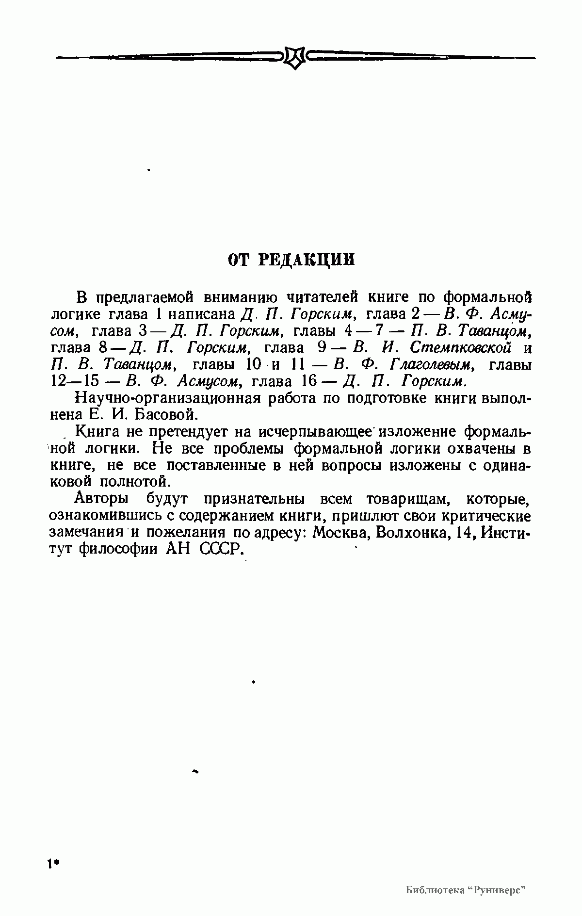 Книга не претендует на исчерпывающее изложение формальной логики. Не все проблемы формальной логики охвачены в книге, не все поставленные в ней вопросы изложены с одинаковой полнотой.
