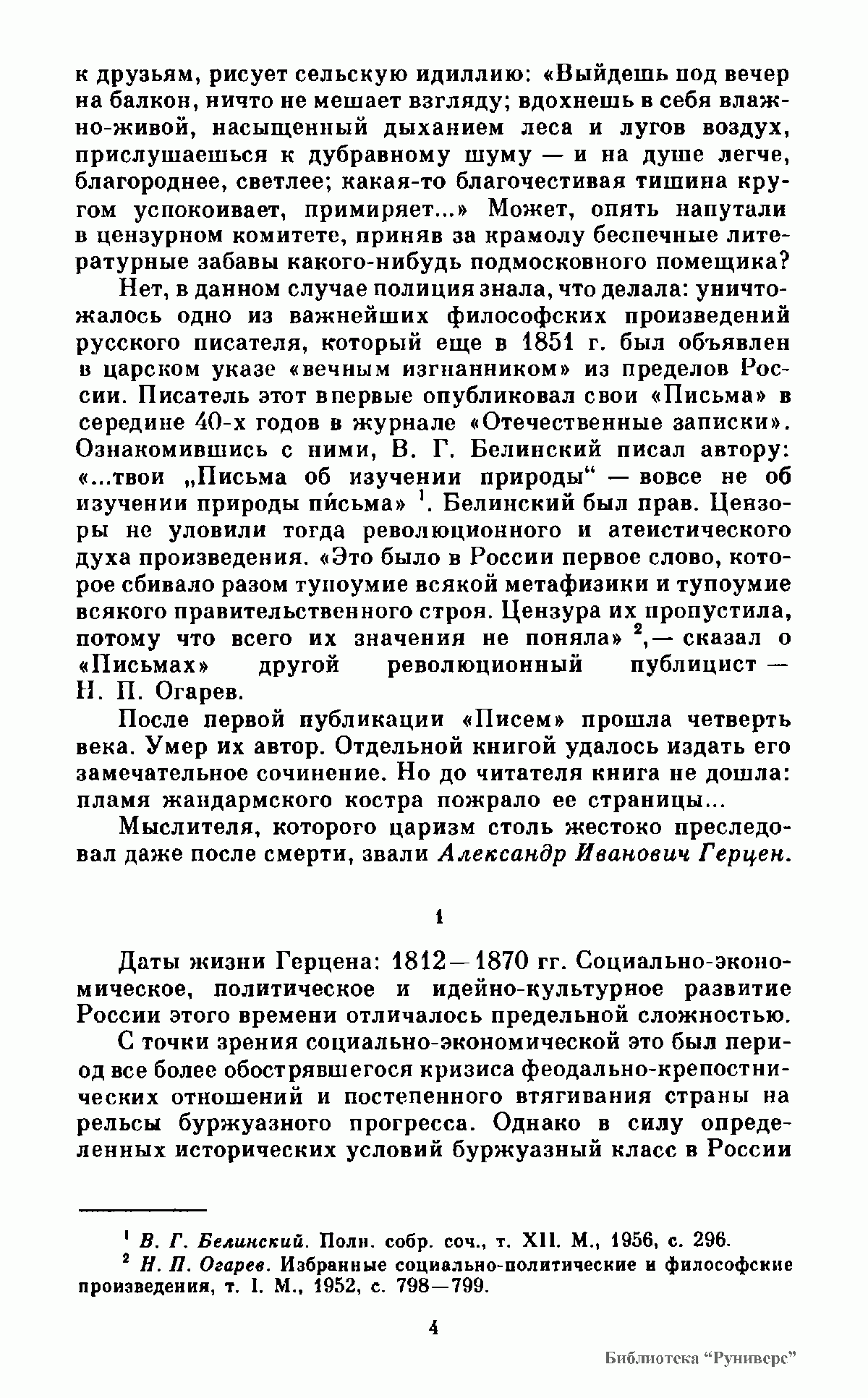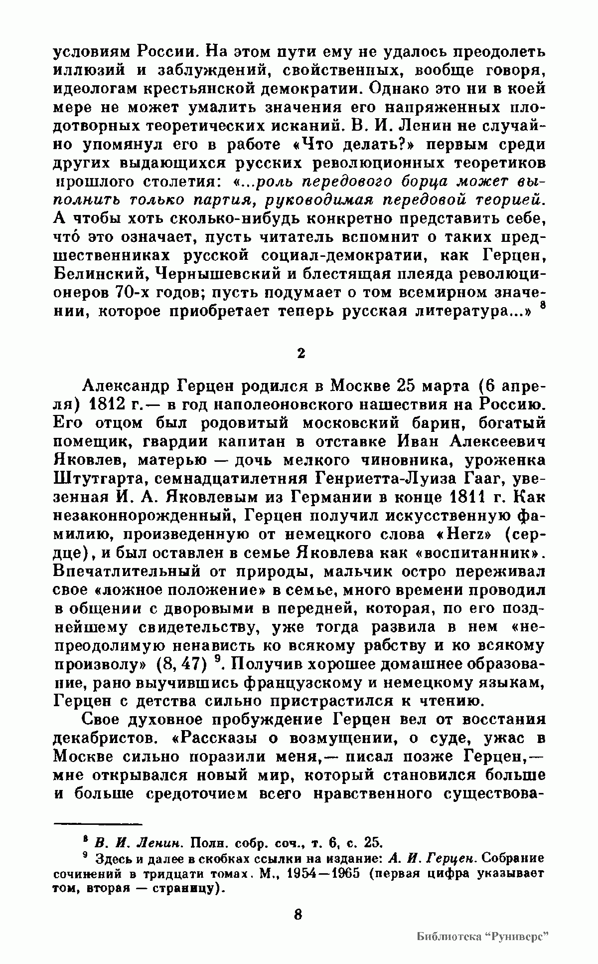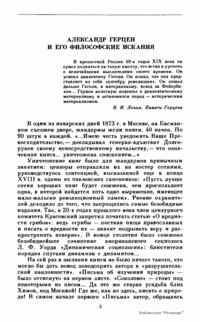 В первый том Сочинений А. И. Герцена, русского революционного демократа, философа-материалиста, включены философские произведения периода 1832—1847 гг.— «Дилетантизм в науке», «Письма об изучении природы» и др. Во второй том Сочинений входят работы 1848—1870 гг.: «С того берега», «Русский народ и социализм», «Концы и начала» и другие.